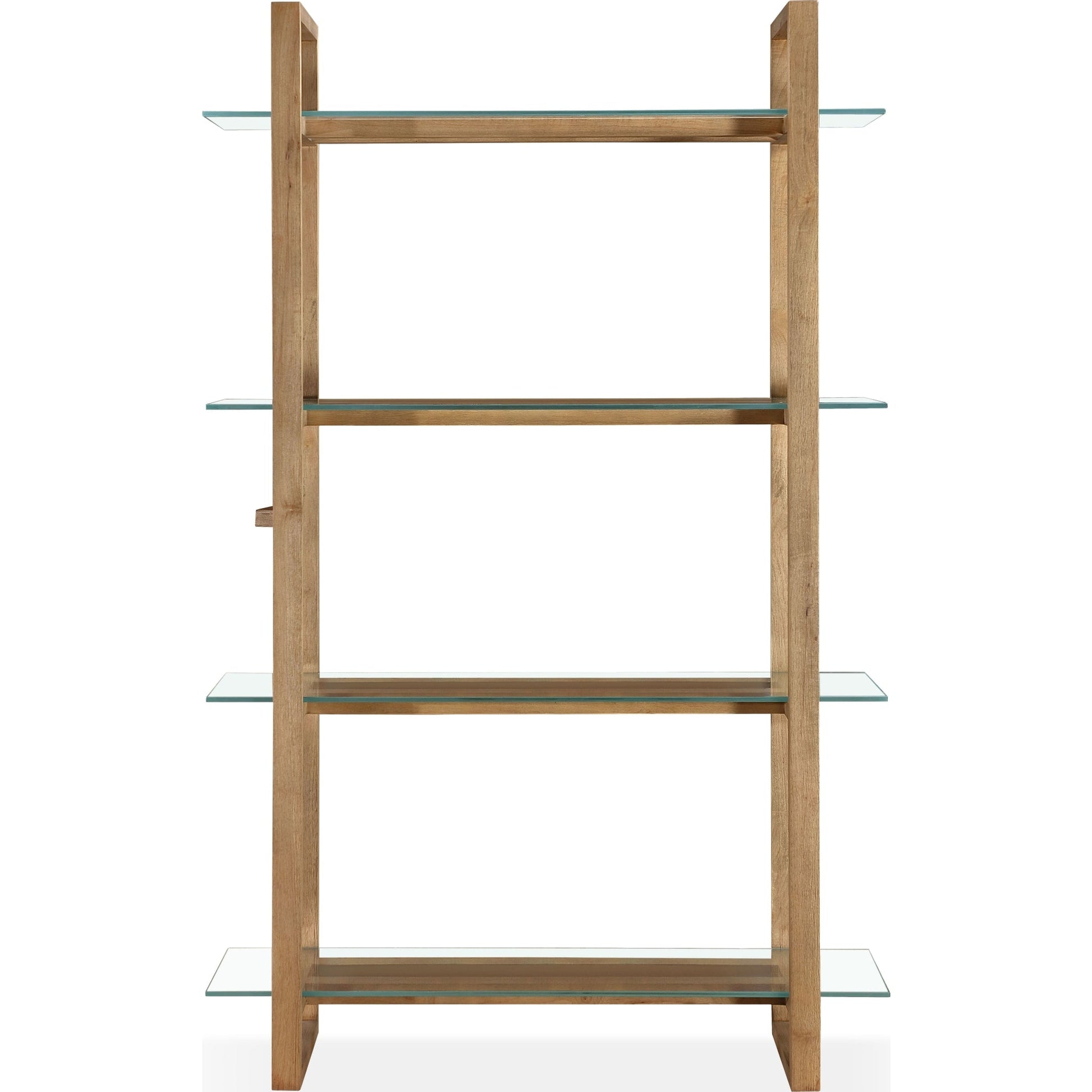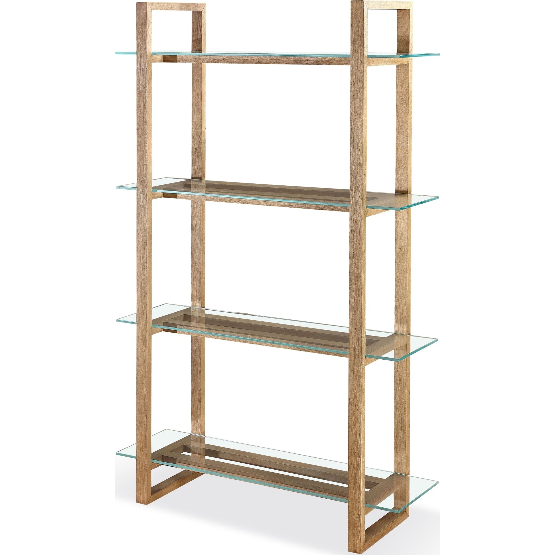 Una moderna libreria in legno massello con ripiani in vetro stile costiero