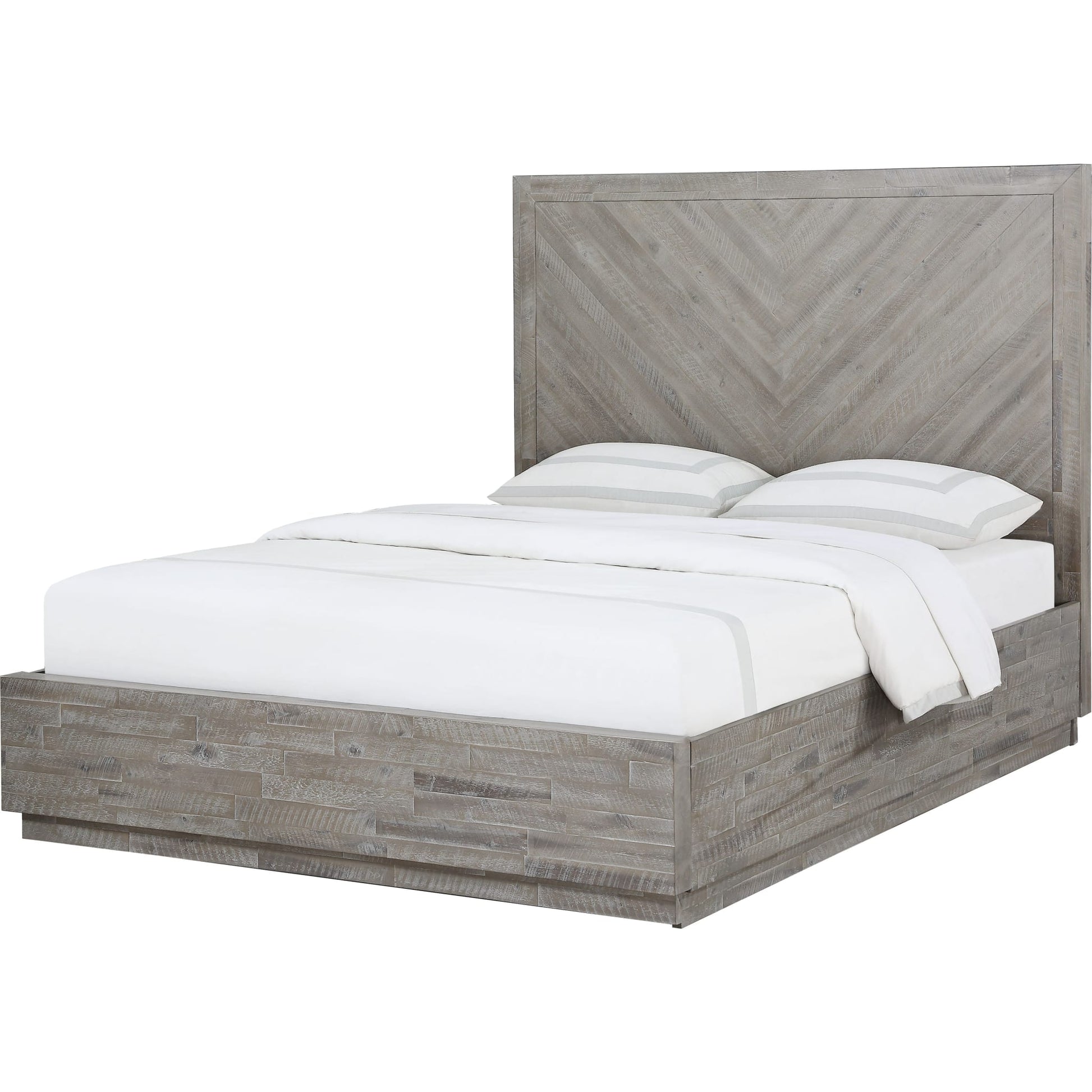 Rustico e contemporaneo. Il fascino della collezione Alexandra deriva dall'acacia grezza utilizzata per la sua creazione. Le assi di legno massello, selezionate a mano, vengono accuratamente levigate, tinteggiate e imbiancate per ottenere un effetto legno di deriva che ne accentua le venature attive e fa risaltare nodi e segni naturali derivanti dal processo di fresatura. Vengono poi intarsiate su compensato per creare un elegante motivo a spina di pesce e rifinite con sottili maniglie in metallo per un tocco contemporaneo finale.